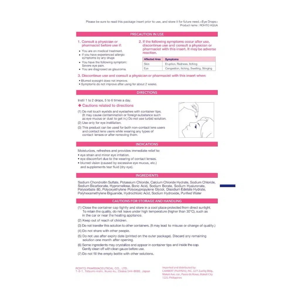 *******ROHTO EYE DROPS AQUA can also be used to ease eye discomfort and irritation due to smoke, dust, wind, sun glare, and chlorinated water.